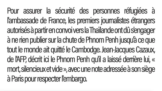 To ensure the safety of everyone sheltering in the French embassy, the first foreign journalists allowed to leave in a convoy to Thailand agreed not to publish anything about Phnom Penh’s fall until everyone had left Cambodia safely. Here is AFP’s Jean-Jacques Cazaux’s graphic description of the Phnom Penh he left behind — ‘dead, silent and empty” — with a note to his head office in Paris to respect the embargo.