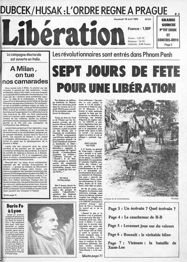 The front page of the French newspaper Libération on Friday, April 18, 1975, with the headline reading “SEPT JOURS DE FÊTE POUR UNE LIBÉRATION” (“Seven Days of Celebration for a Liberation”).