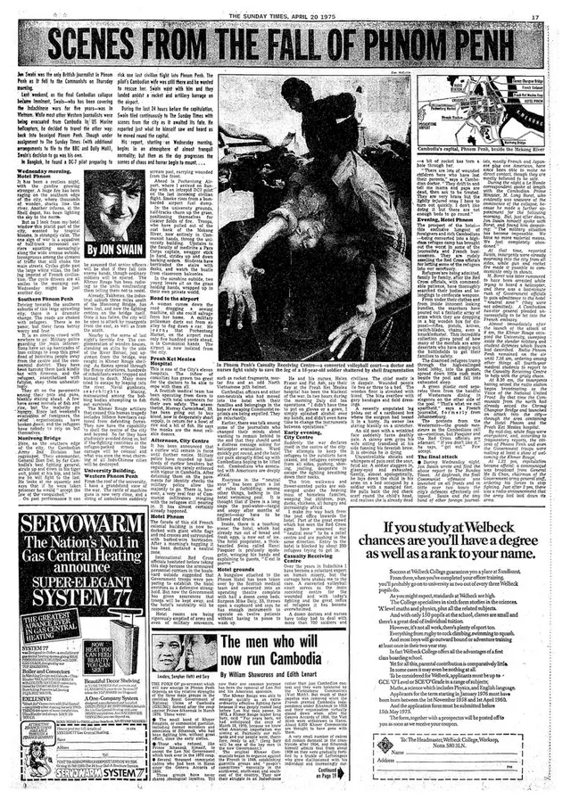 A page from The Sunday Times on Sunday, April 20, 1975, with the headline, “SCENES FROM THE FALL OF PHNOM PENH.”