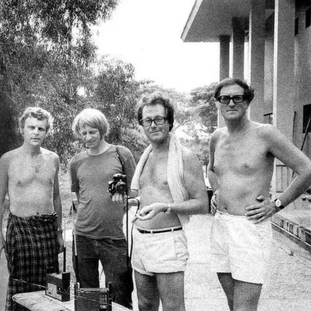 Herman Lindqvist of Expressen, Sven-Erik Sjöberg of DN, Olle Tolgraven of SVT, and Sven-Oskar Ruhmén of Aftonbladet stand in Khmer Rouge-controlled Phnom Penh in 1975. The photo was taken by New York Times journalist Sydney Schanberg using Ruhmén’s camera.